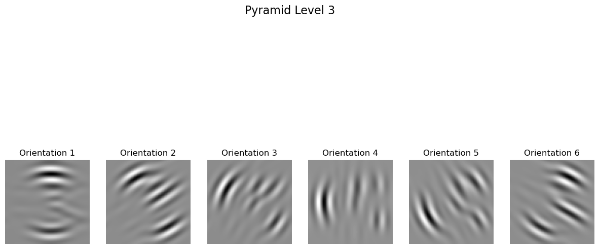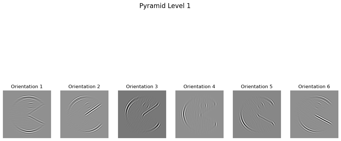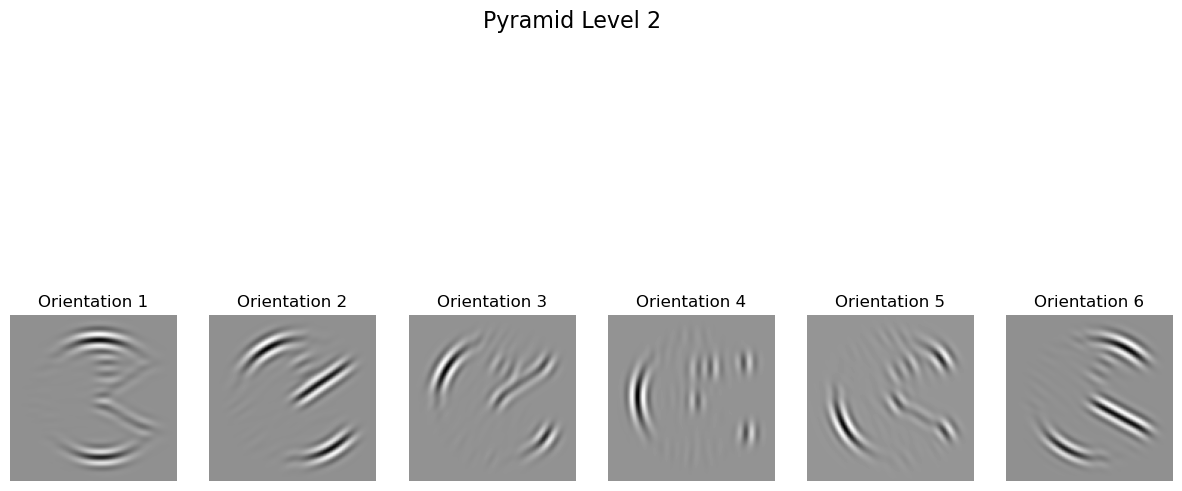 After aligning the oriented filters, the next step was to implement the oriented pyramid, an extension of the Laplacian pyramid. The oriented pyramid construction follows the diagram and methodology outlined in the paper, where each level of the pyramid captures specific frequency and orientation information.